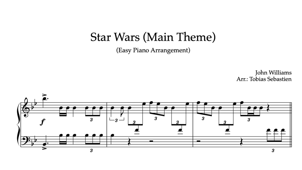 Star Wars Theme (Easy Piano Arrangement)£3.50£3.50https://schema.org/InStockgbpTobias Sebastien0 ratingsAn easy piano arrangement of the Star Wars ThemeI want this!Size41.1 KBLength2 pagesAdd to wishlist New wishlistCopy product URL